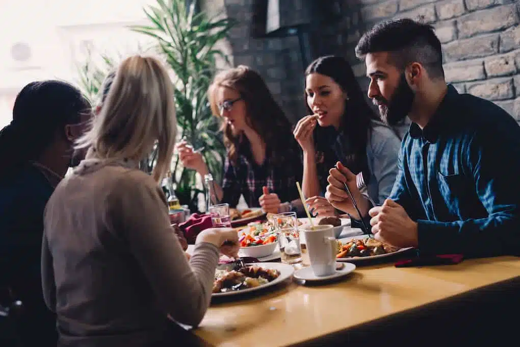 Group of happy business people eating together in restaurant